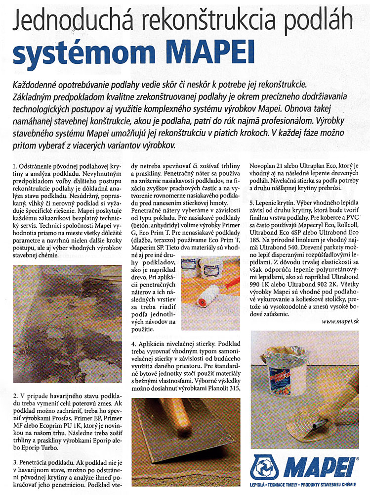 DOMO 05/2010 - Cechové dni 2010ZobraziťDOMO 04/2010 - Súťaž: "Najlepšia realizácia"ZobraziťDOMO 03/2010 - X. snem Cechu podlahárov SlovenskaZobraziťDOMO 02/2010 - Problematika ESD (ElektroStatic Discharge)ZobraziťDOMO 05/2009 - Cechové dni 2009 ZobraziťDOMO 04/2009 - Súťaž o najlepšiu realizáciu 2008 ZobraziťDOMO 04/2009 - Na výstavách Coneco a DomexpoZobraziťDOMO 03/2009 - IX. snem a Ples podlahárov ZobraziťDOMO 04/2008 - Najlepšia realizácia v roku 2007 ZobraziťEUROSTAV 1/2007 - Podlahy v bytových domochZobraziťEUROSTAV 7/2006 - Trendy podlahových krytín pre obch., administratívne a priemyselné budovyZobraziťUROB SI SÁM 4/2008 - Jednoduchá rekonštrukcia podláh systémom MAPEIZobraziť